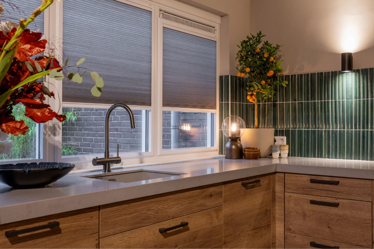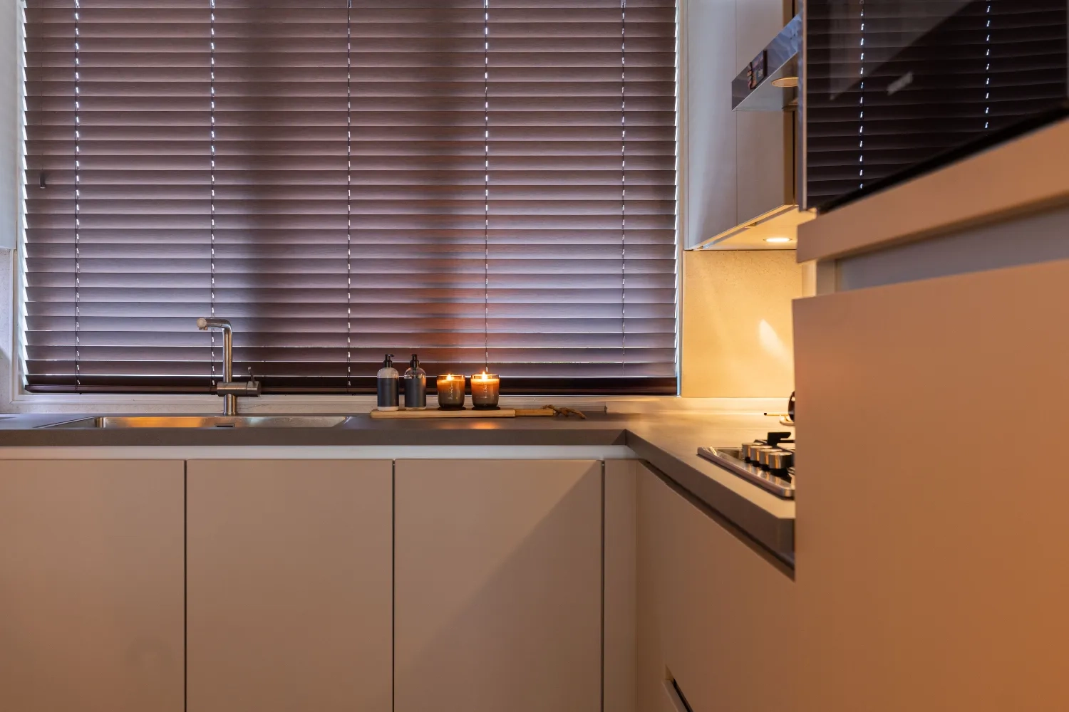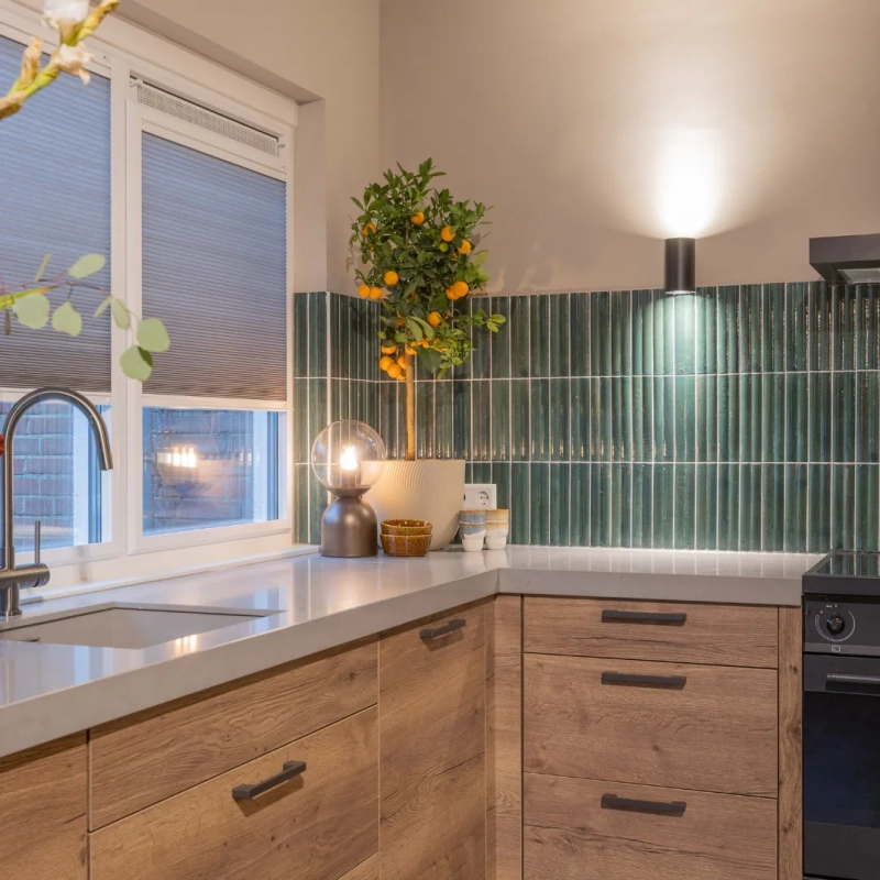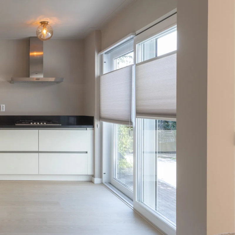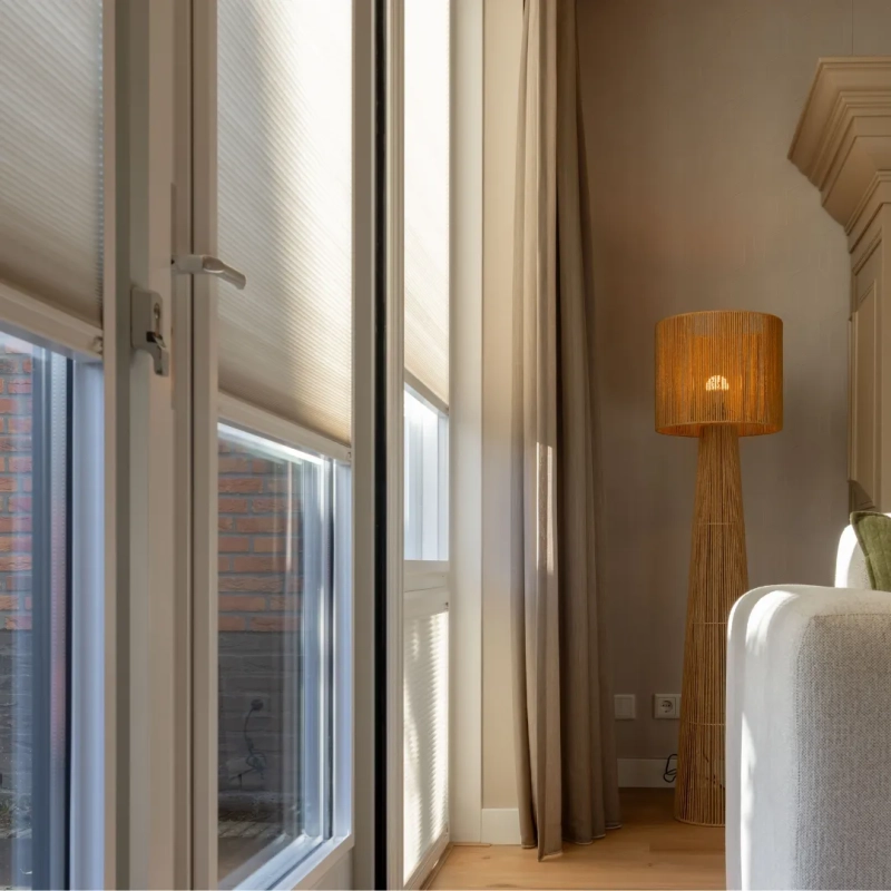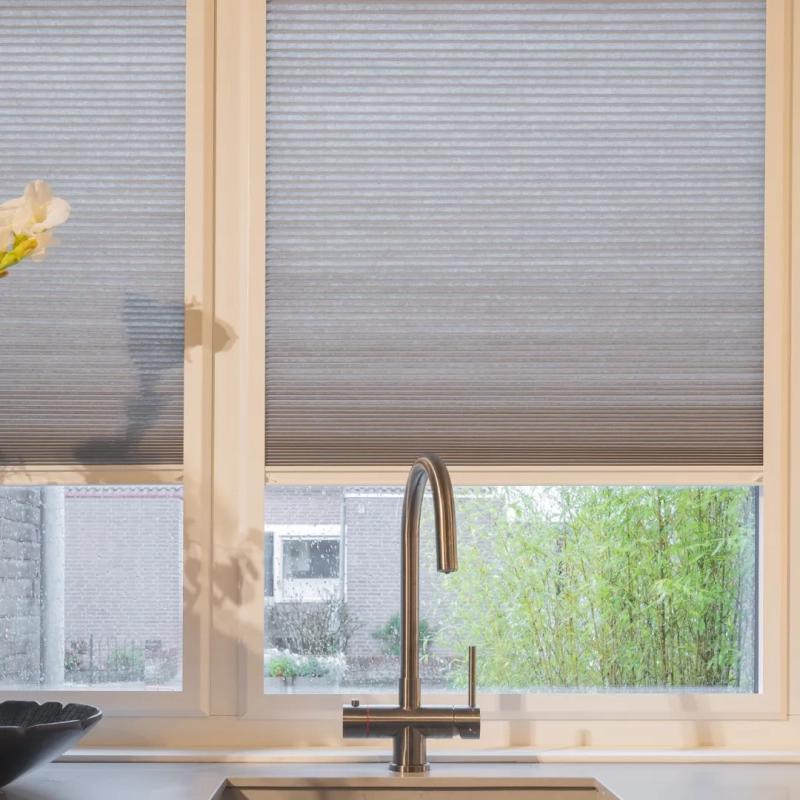 In de keuken kozen we voor een vrijhangend plisségordijn van KeJe, perfect op maat gemaakt. Dankzij de subtiele kleur sluit het gordijn prachtig aan op de muur en zorgt het voor sfeer én privacy. KeJe plisségordijnen zijn verkrijgbaar in veel kleuren, zodat er altijd een tint is die bij jouw interieur past. Zo maak je elke ruimte helemaal af!