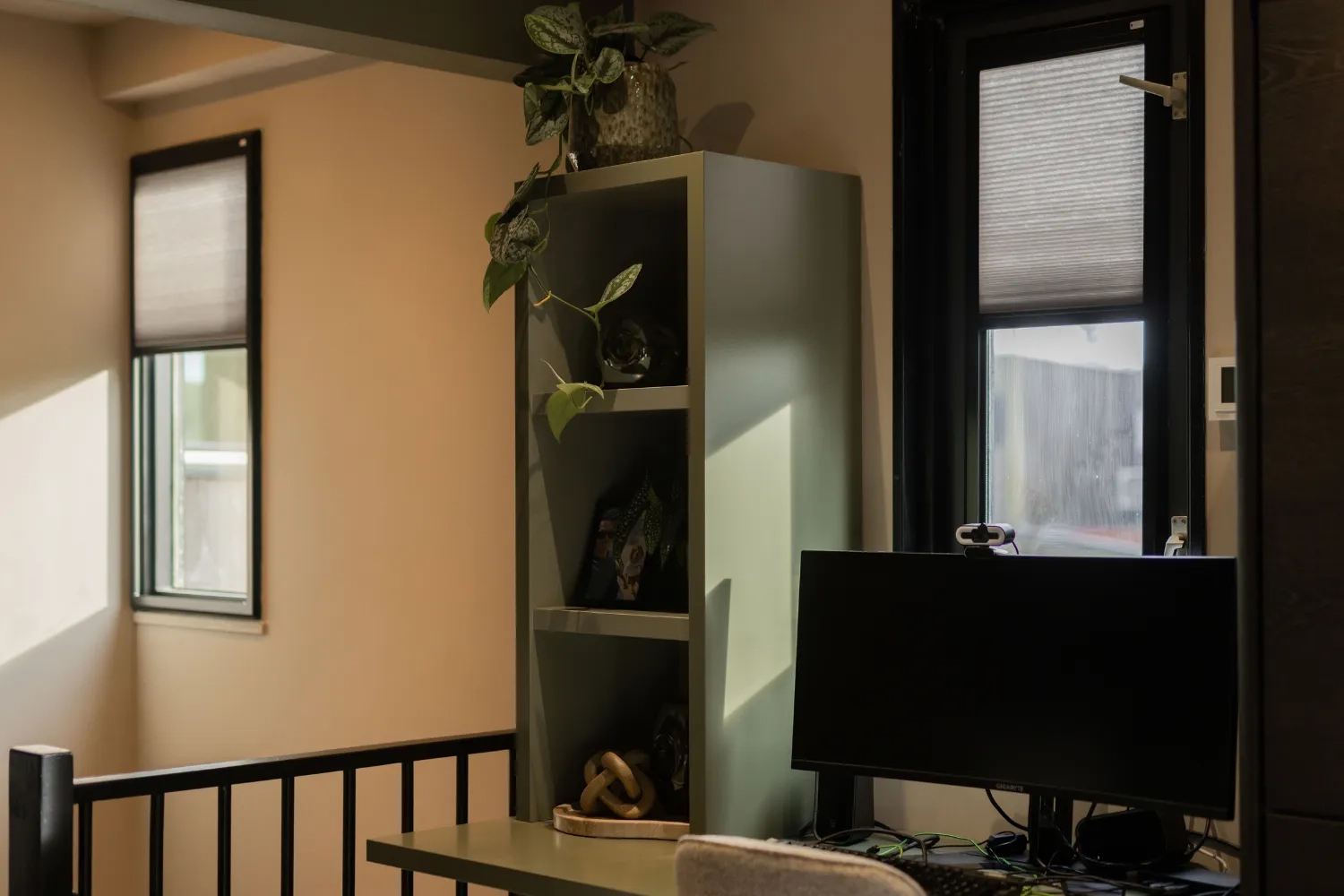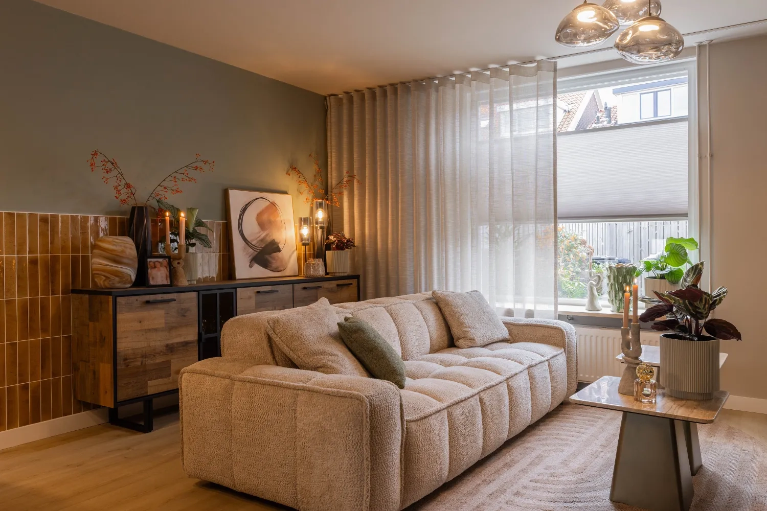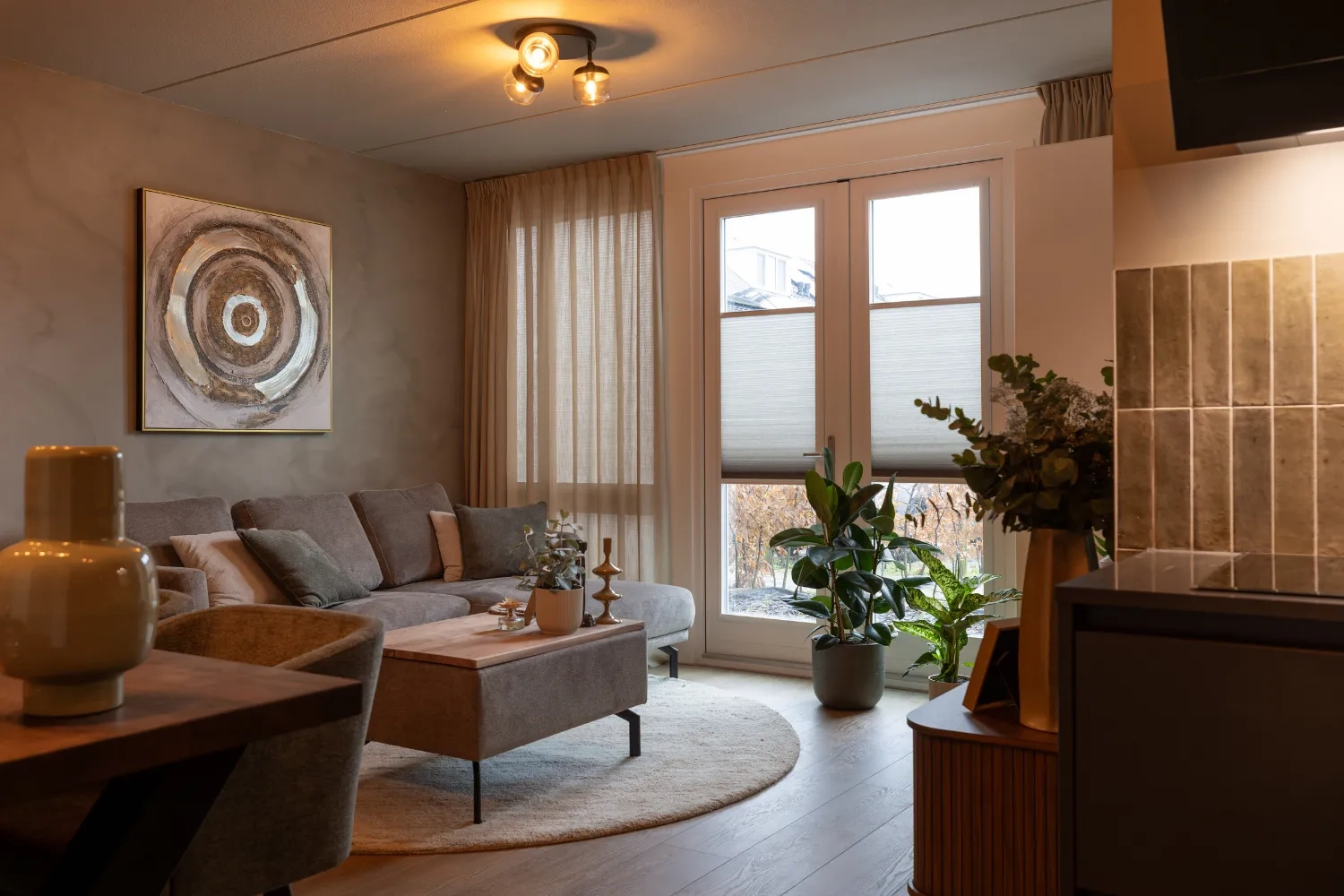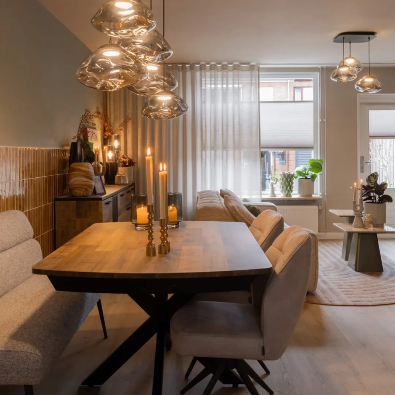 In de keuken kozen we voor een vrijhangend plisségordijn van KeJe, perfect op maat gemaakt. Dankzij de subtiele kleur sluit het gordijn prachtig aan op de muur en zorgt het voor sfeer én privacy. KeJe plisségordijnen zijn verkrijgbaar in veel kleuren, zodat er altijd een tint is die bij jouw interieur past. Zo maak je elke ruimte helemaal af!