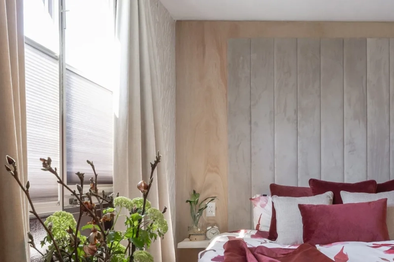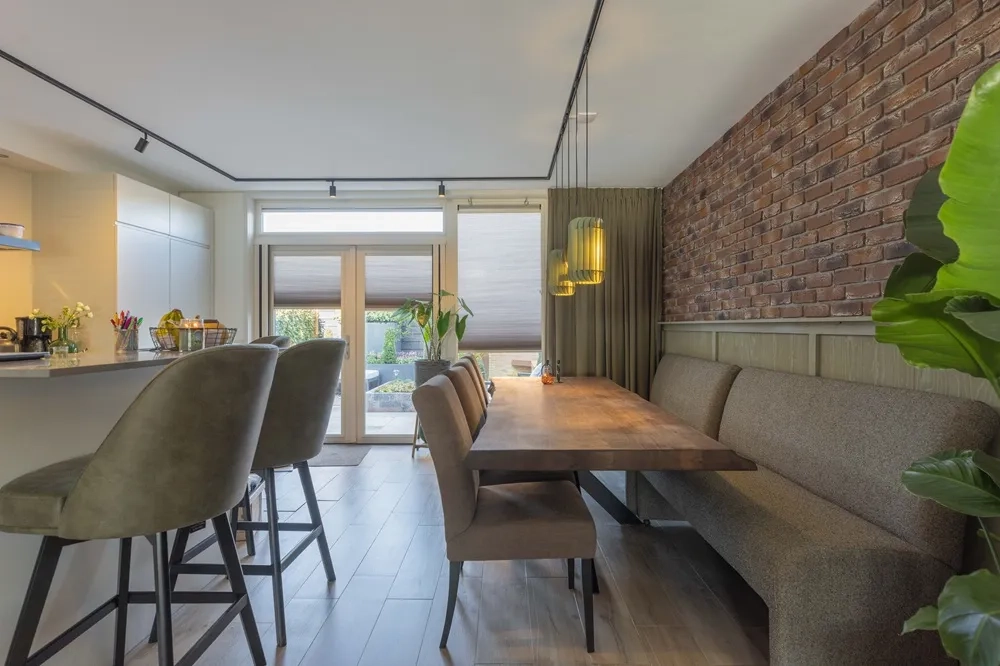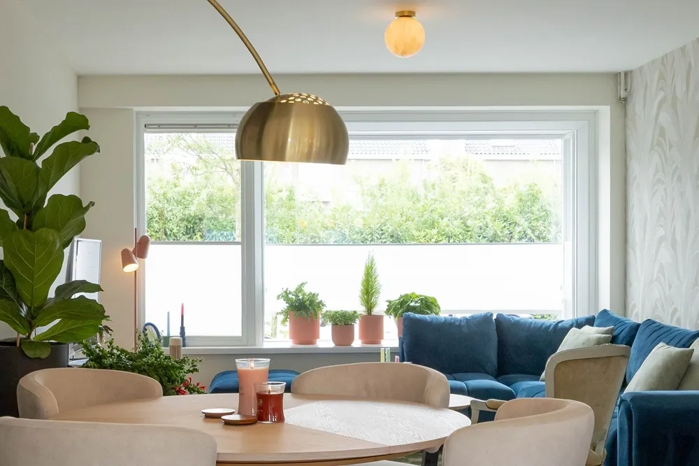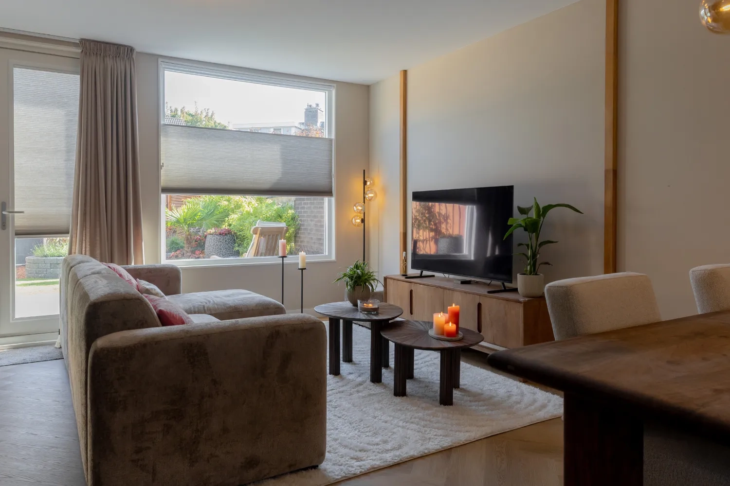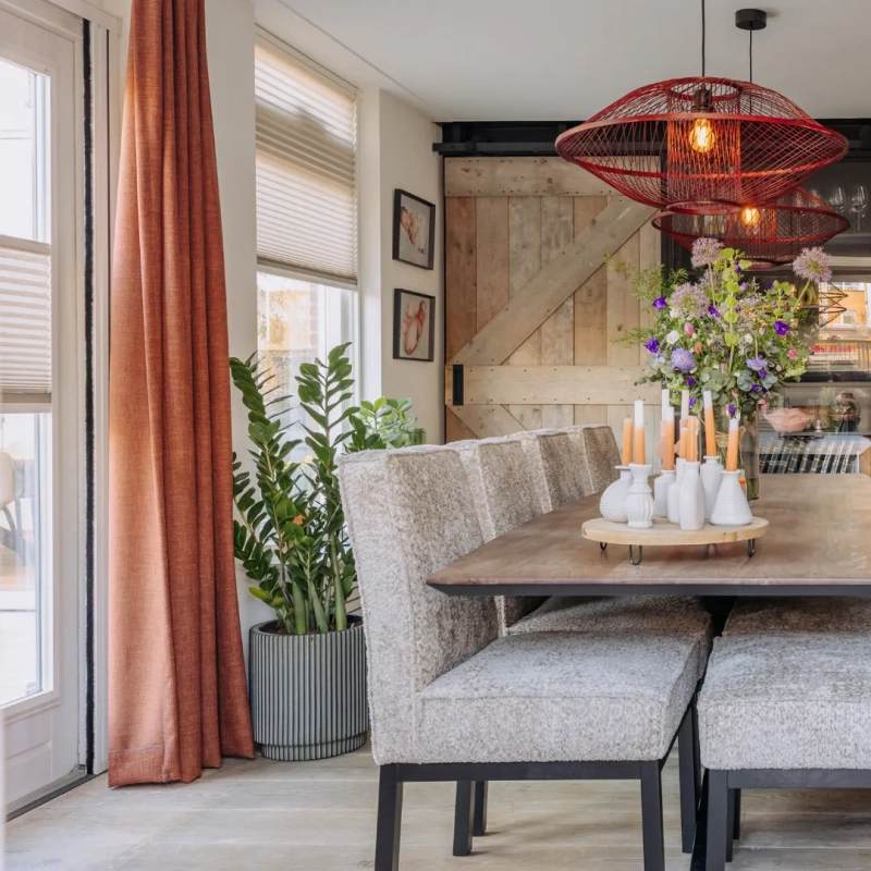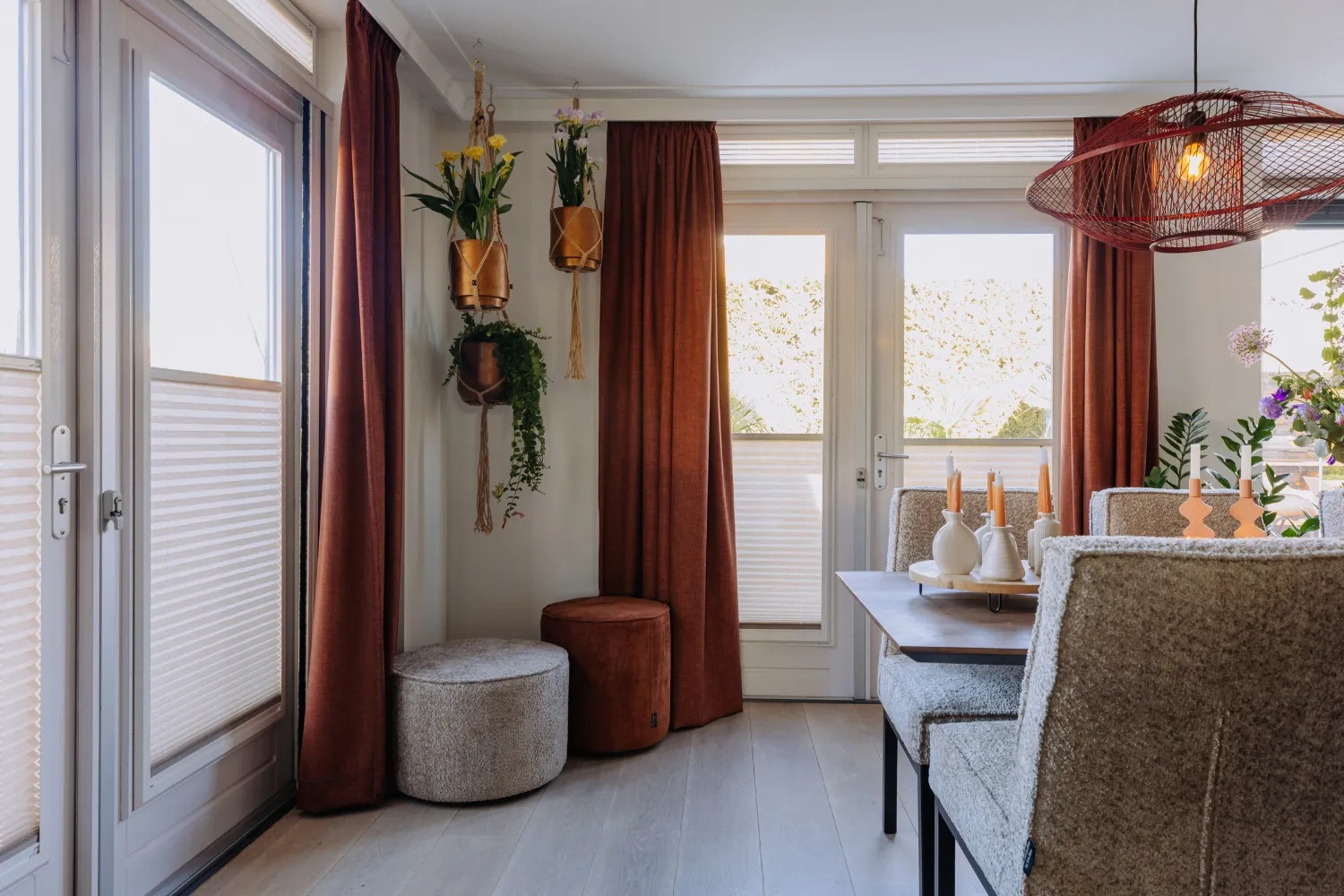 In aflevering 1 van het nieuwe seizoen van De Grote Tuinverbouwing richtte styliste Djamilla een woonkamer in Bunschoten-Spakenburg opnieuw in. Om het gevoel van gemeenschapszin te versterken, koos ze voor een grotere eettafel met bank en een lichte fauteuil die de zit- en eethoek met elkaar verbindt. Het vrijhangende plisségordijn in stofkleur D75004-25 sluit hier perfect bij aan en vormt een rustige basis voor de inrichting.