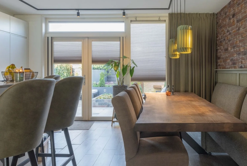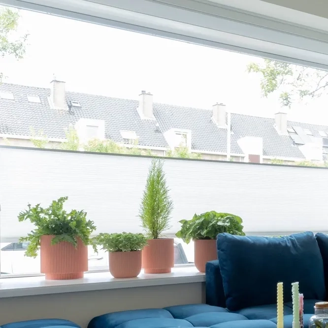 KeJe Splendid Pliss; een plisségordijn in een aluminium frame. Dankzij deze combinatie past de raamdecoratie perfect in het frisse, lichte interieur. De Splendid Pliss zorgt niet alleen voor een zachte lichtinval, maar ook voor de gewenste privacy, zónder het zicht op de tuin volledig te verliezen. De ideale oplossing voor een ruimte waarin sfeer, comfort én functionaliteit samenkomen.