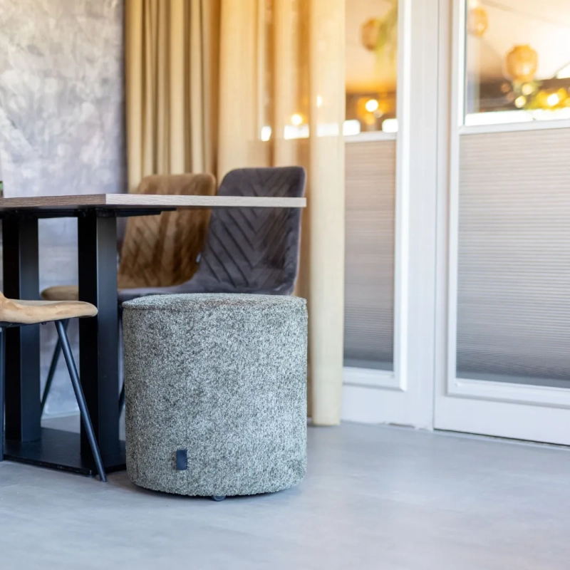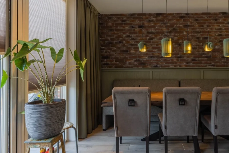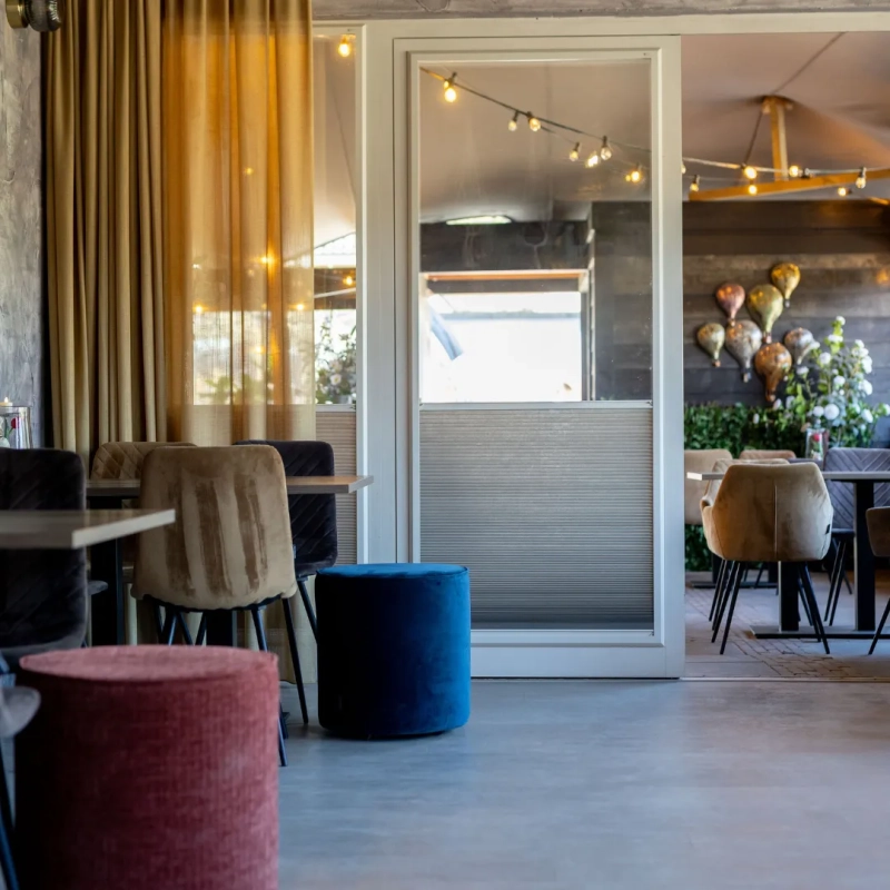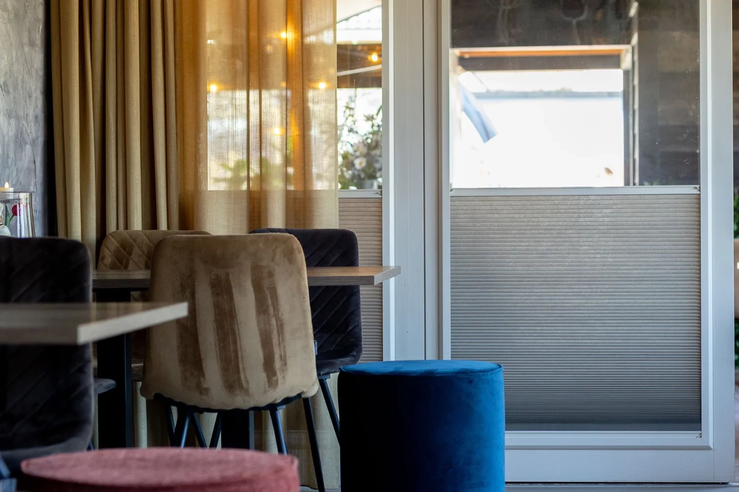 De KeJe Splendid Pliss in een mooie duostof. Deze stof zorgt voor een subtiele balans tussen lichtinval en privacy, en past perfect bij de sfeervolle uitstraling van het restaurant.