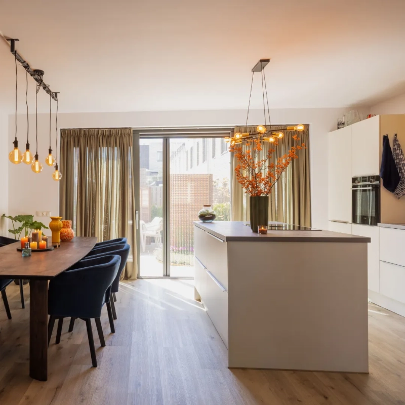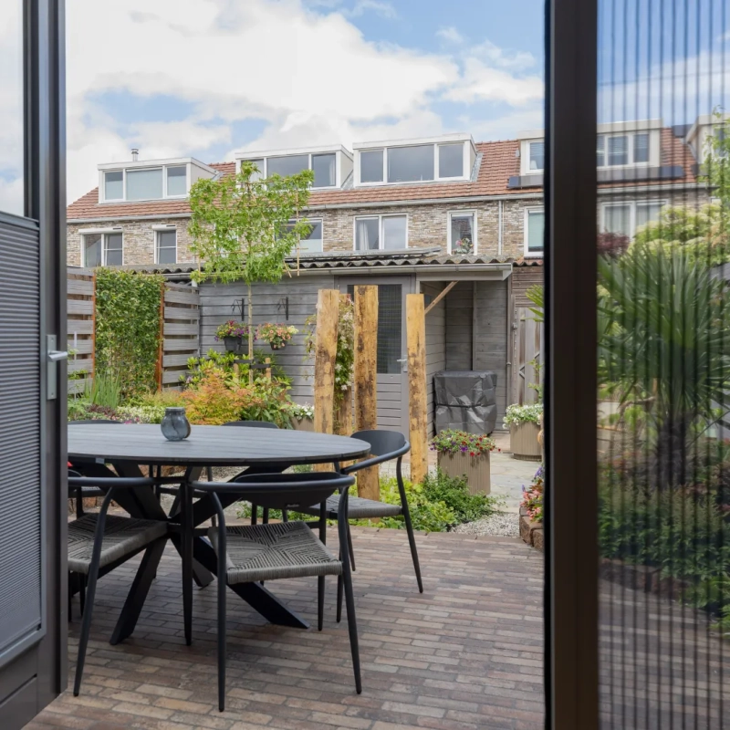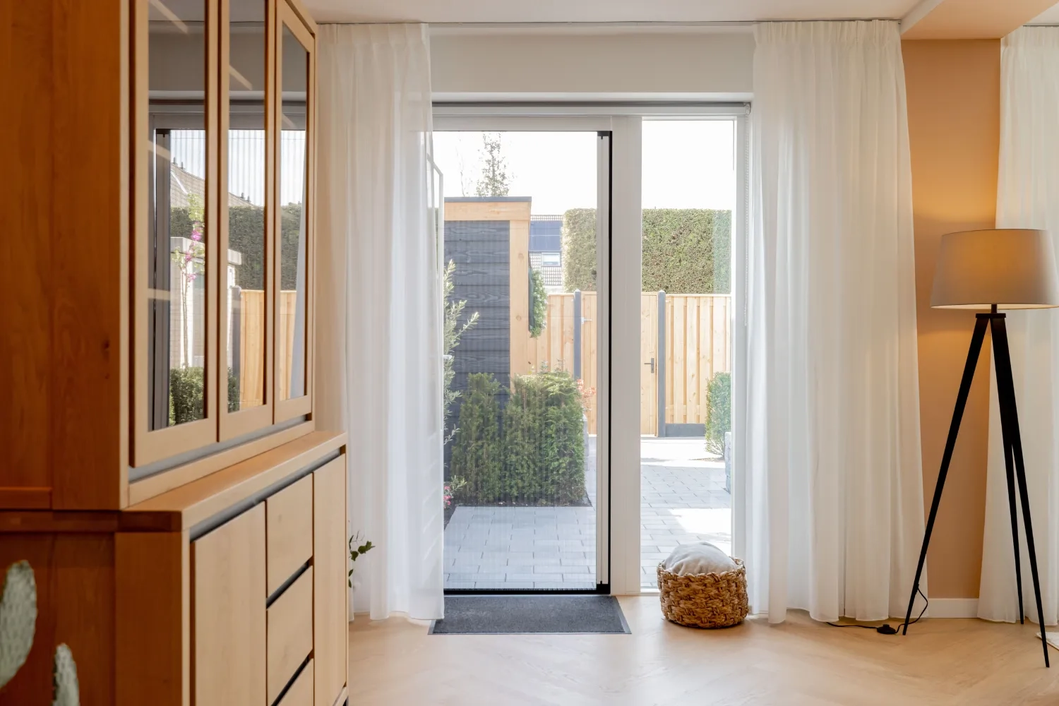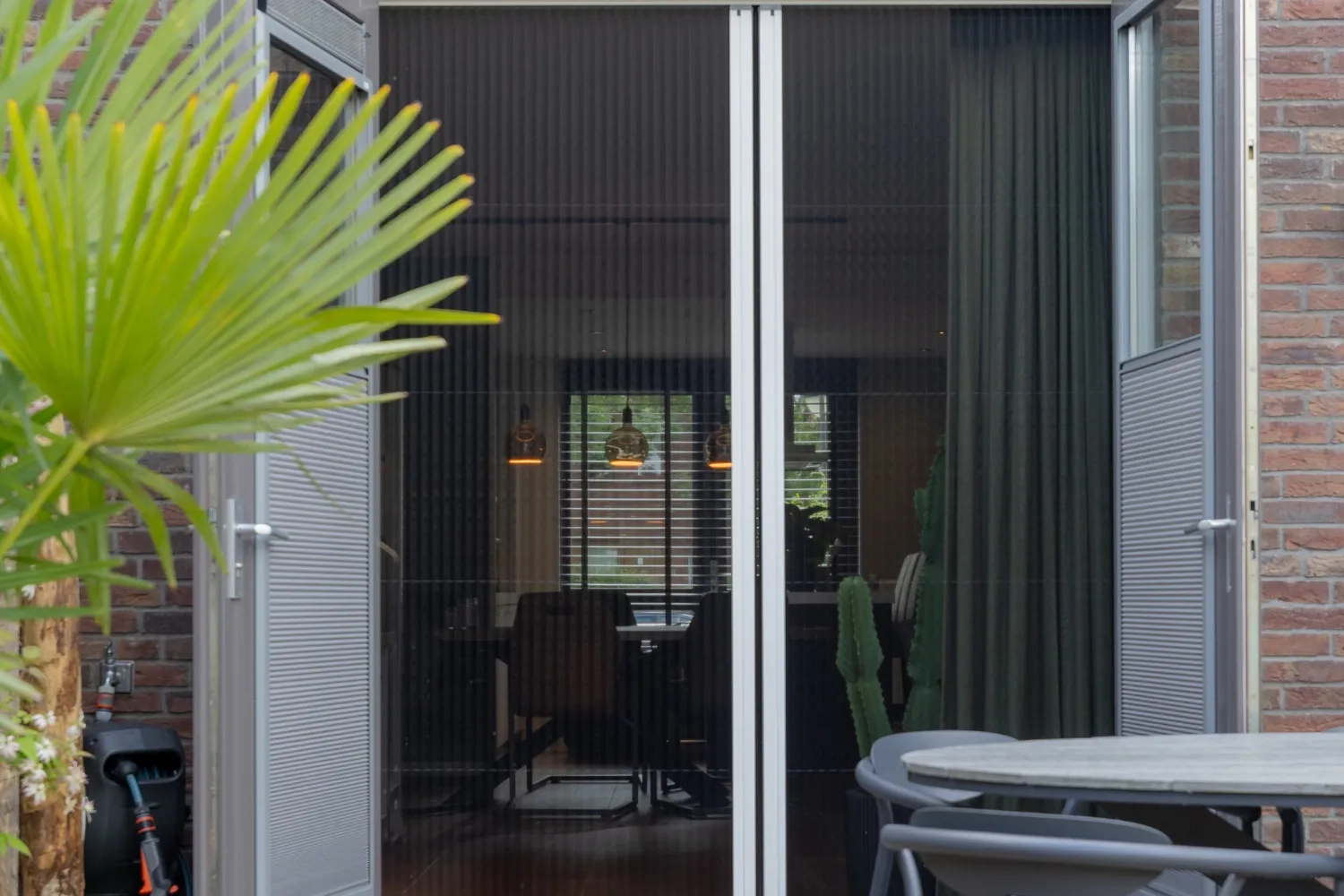 Ook buiten werd aandacht besteed aan comfort en gebruiksgemak, met de plaatsing van een originele 3-delige hordeur op de dag. Een stijlvolle en functionele oplossing die perfect aansluit bij de vernieuwde uitstraling van de woning.