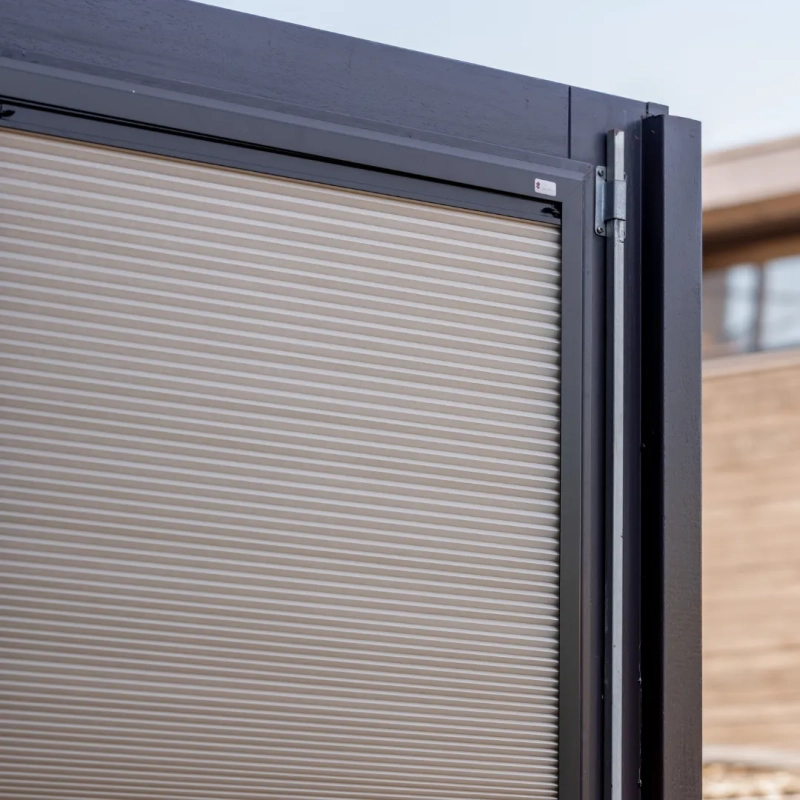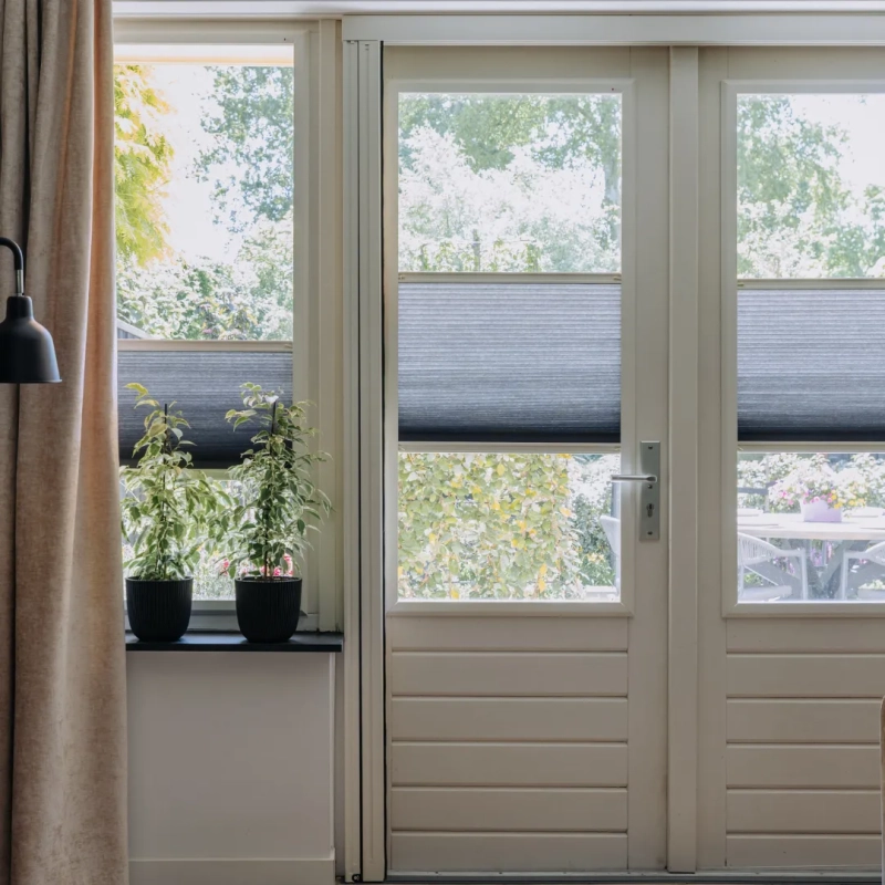 De ramen kregen een upgrade met de Splendid Pliss, uitgevoerd in doekkleur D60053, eveneens met een 7016 framekleur. Dankzij montage op de kozijn kunnen de deuren geopend worden terwijl de raamdecoratie blijft hangen.