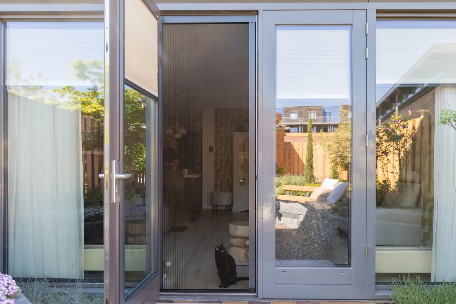 De dubbele originele hordeur van KeJe is dé oplossing voor grote deuropeningen zoals schuifpuien of openslaande tuindeuren. Dankzij het slanke profiel en maatwerk in elke gewenste RAL-kleur sluit hij perfect aan bij het kozijn. Zelfs bij schuifpuien met een uitstekende deurklink of een slot aan de buitenzijde bieden wij een passende oplossing.