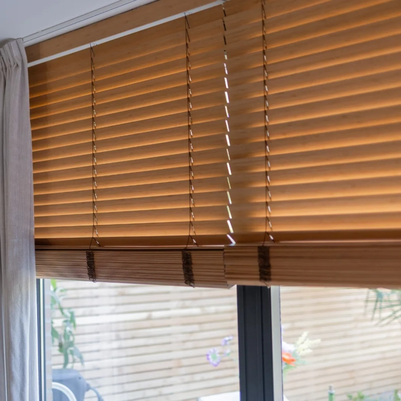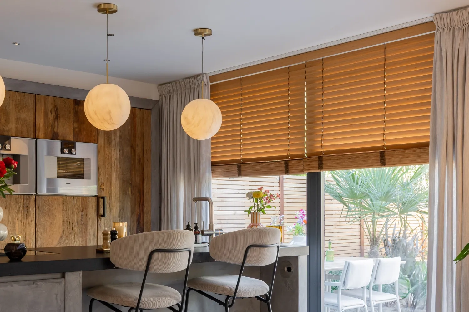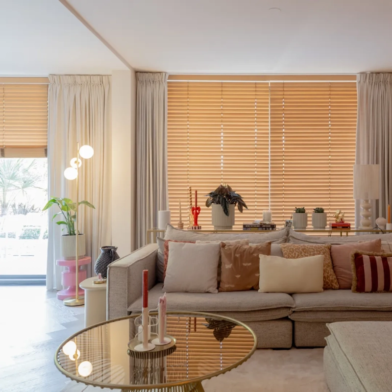 De vrijhangende houten jaloezieën, met een lamelbreedte van 50 mm, zorgen voor een sfeervolle lichtinval en een natuurlijke uitstraling. Dankzij de Motion bediening zijn ze bovendien eenvoudig elektrisch te bedienen, wat zorgt voor extra comfort en gebruiksgemak.
