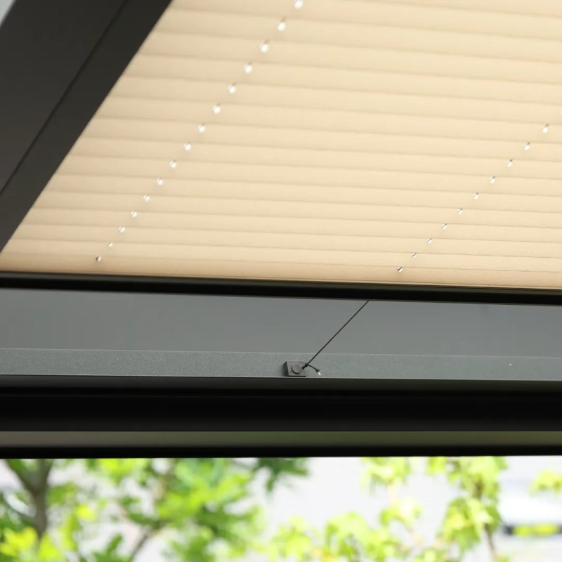 Voor de raambekleding viel de keuze op het vrijhangend plisségordijn Twinpull in stofkleur D0200, uitgevoerd met top down bottom up bediening, en de Splendid Pliss in de deur in dezelfde kleurstelling.
