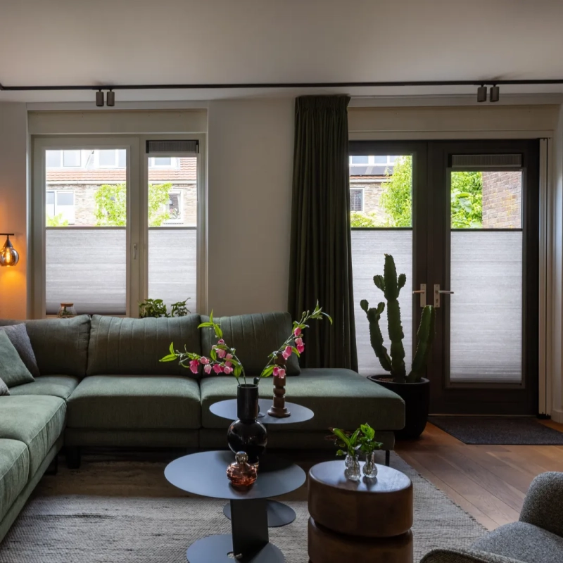 Voor de raambekleding werd gekozen voor de Splendid Pliss in stofkleur D75011, een prachtige neutrale tint die mooi aansluit op het groene interieur. Deze werd toegepast in zowel framekleur 9010 als 7037, afgestemd op de verschillende kozijnen in huis.