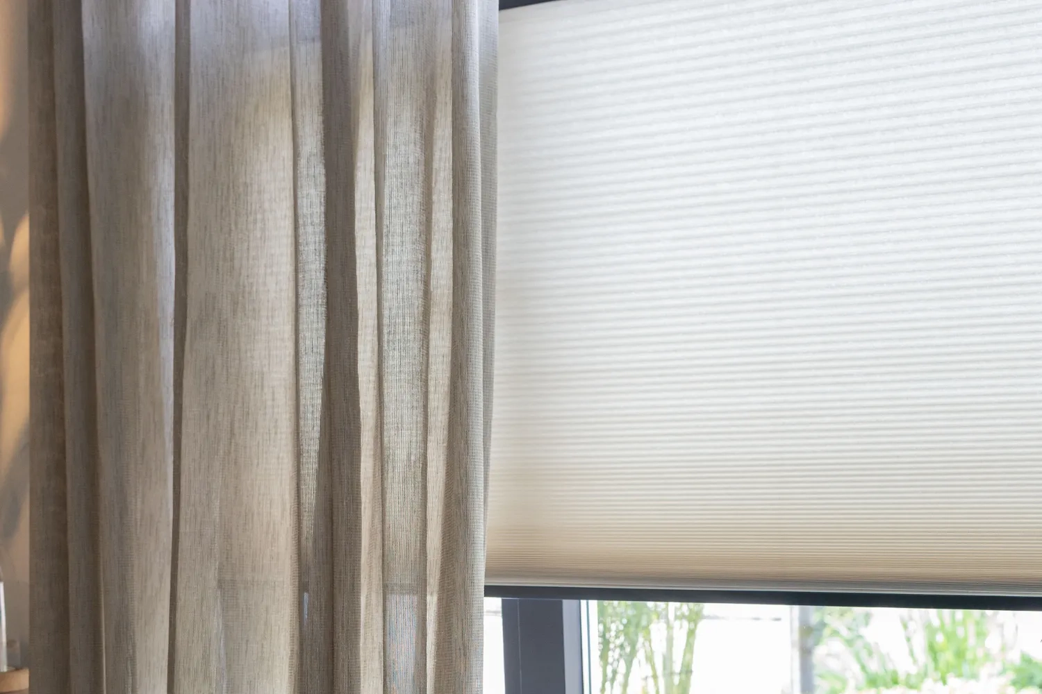 Raamdecoratie zonder boren of schroeven, beschikbaar in meer dan 100 verschillende stofsoorten, van lichtdoorlatend tot volledig verduisterend.