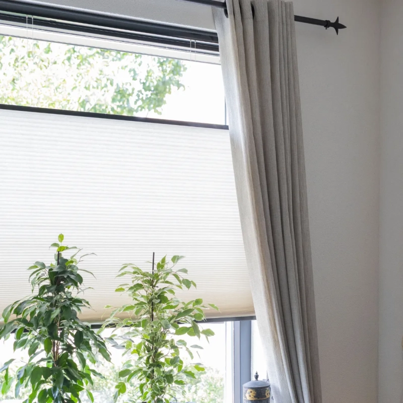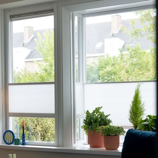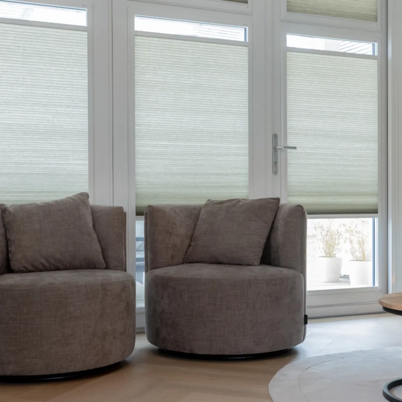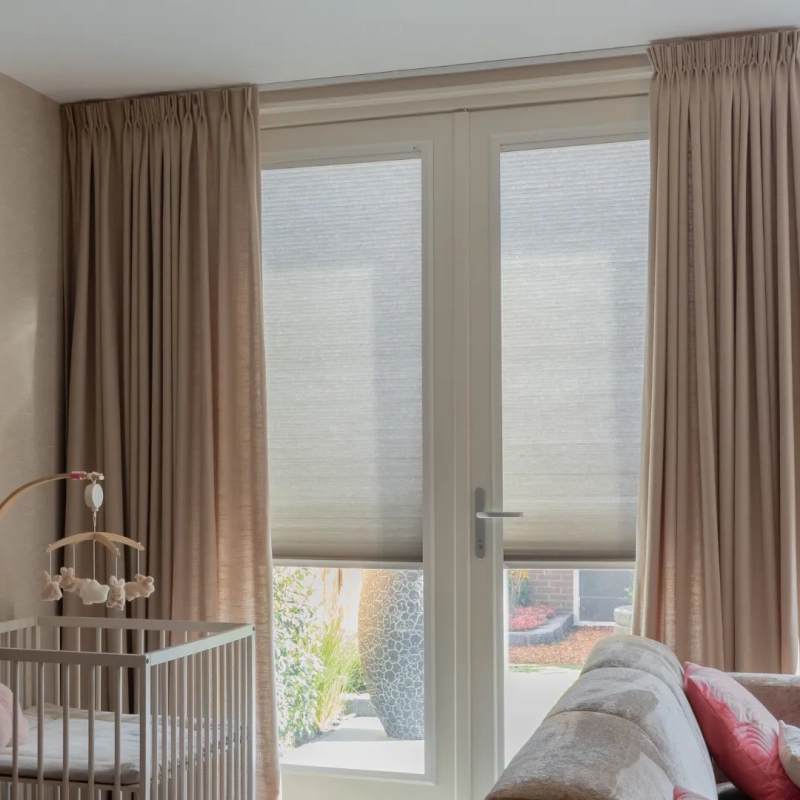 Het vrijhangende plisségordijn is de ideale keuze voor bredere ramen. Door te kiezen voor dezelfde duo-stof D75001-25 als in de Splendid Pliss, ontstaat er een mooie eenheid in de ruimte. De lichte stof zorgt voor veel natuurlijke lichtinval en een frisse uitstraling, terwijl de erker vanuit elke hoek dezelfde stijl en sfeer behoudt. Zo vormt de raamdecoratie een harmonieus geheel dat zowel praktisch als sfeervol is.