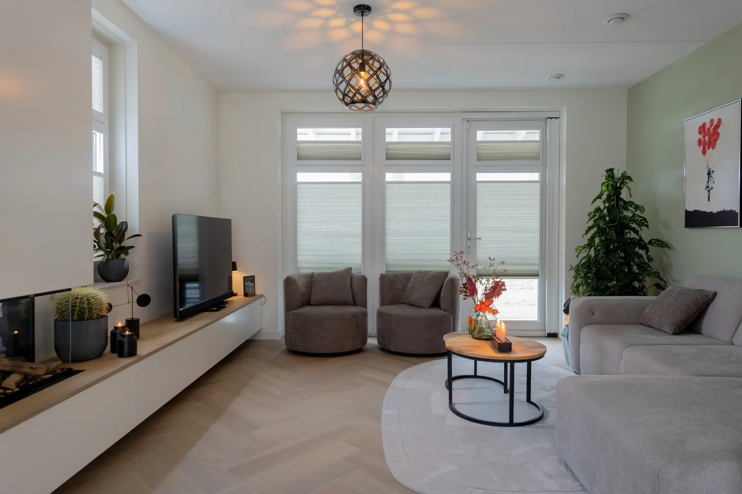 Sanne en Mark hebben sinds enkele maanden de sleutel van hun nieuwe woning. Beiden hebben een drukke baan en zijn daarnaast fanatieke sporters. Hun huis moet dan ook vooral een plek zijn om écht tot rust te komen. Hoewel ze niet bang zijn voor een beetje kleur, is een rustige, harmonieuze sfeer voor hen het belangrijkst. Om dat gevoel te creëren, werd gekozen voor een plisségordijn in frame – de Splendid Pliss – in stofkleur D0200-25 en framekleur 9016. De combinatie zorgt voor een zachte, evenwichtige uitstraling die past bij hun wens voor een sereen, maar levendig interieur.