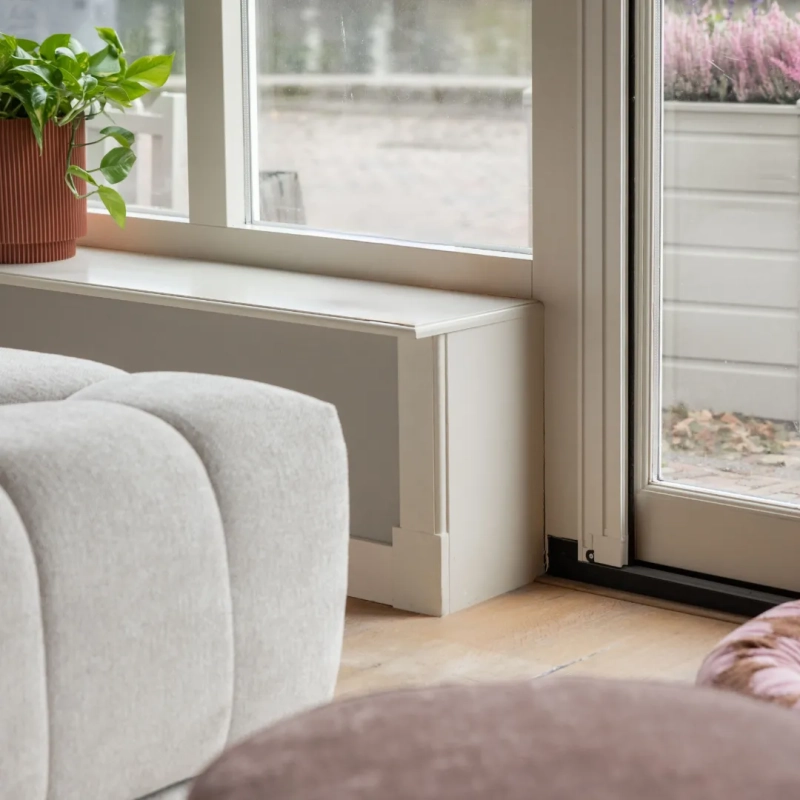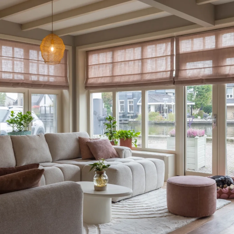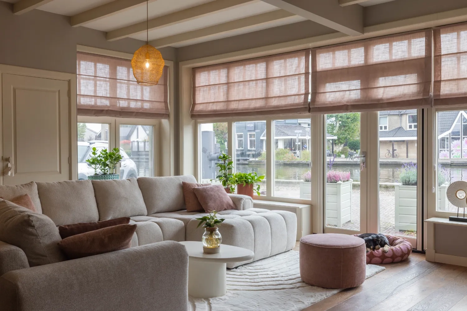 De Splendid Pliss is een plisségordijn in een strak frame dat eenvoudig te monteren is, zonder boren of schroeven. In stofkleur D0200-25 laat het gordijn prettig veel daglicht door, terwijl het tegelijkertijd zorgt voor privacy en rust. Zo ontstaat een interieur dat warmte en ontspanning uitstraalt – precies wat Sanne en Mark voor ogen hadden.