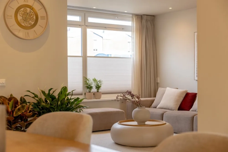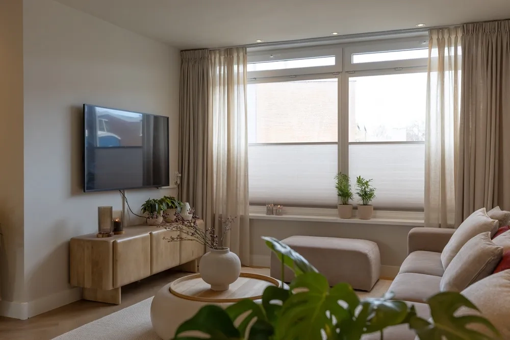 Deze week gaat het team van De Grote Tuinverbouwing langs bij Lynn en Thierry. Sinds mei vorig jaar wonen ze in hun nieuwe huis, waar ze het interieur al grotendeels hebben aangepakt. Toch ontbreekt er nog iets aan het totaalplaatje. Binnen legt Lynn aan Djamilla uit dat het interieur momenteel vrij eentonig is door het gebruik van één kleur. Hierdoor voelt het geheel wat veilig aan en mist het de verbinding tussen de verschillende ruimtes. Ze wil graag meer warmte en kleur toevoegen, al vindt ze het spannend om die stap te zetten. De basis mag rustig blijven, met zachte beigetinten op de muren en het plafond, maar ze is wel toe aan meer sfeer en een persoonlijkere uitstraling. De op maat gemaakte raamdecoratie van KeJe, uitgevoerd in de gekozen DUO-stof, kan daarbij helpen door extra diepte, warmte en een gezellige uitstraling aan het interieur toe te voegen