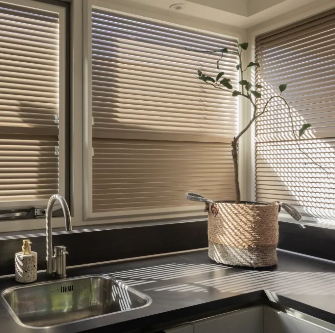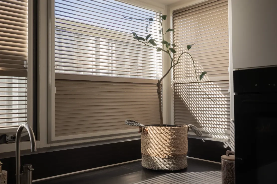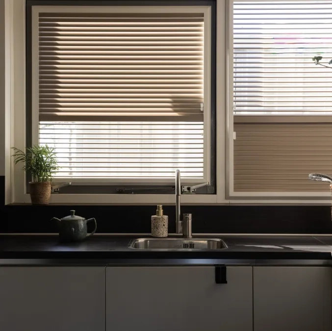 De houten jaloezieën van KeJe zijn een stijlvolle en praktische keuze voor raamdecoratie. Deze jaloezieën worden volledig op maat gemaakt en zijn uitgevoerd met accu-bediening, waardoor je de lamellen eenvoudig kantelt voor de juiste balans tussen licht en privacy. De natuurlijke uitstraling van hout zorgt voor warmte in het interieur, terwijl de elektrische bediening comfort en gebruiksgemak toevoegt aan het dagelijks wonen.