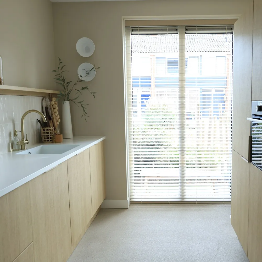 Om de nieuwe look helemaal af te maken, koos Alena voor houten jaloezieën van KeJe. Deze passen perfect bij de natuurlijke en lichte uitstraling van hun interieur. Overdag filteren ze het zonlicht op een zachte manier, terwijl ze ’s avonds zorgen voor een warme, gezellige sfeer. De lichte kleur sluit naadloos aan bij de rest van het interieur en draagt bij aan een rustige, harmonieuze uitstraling.