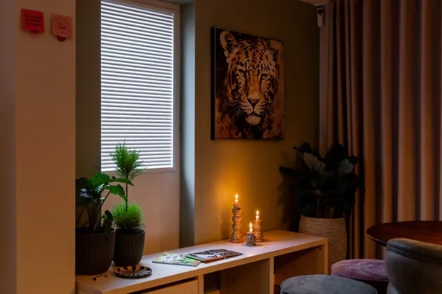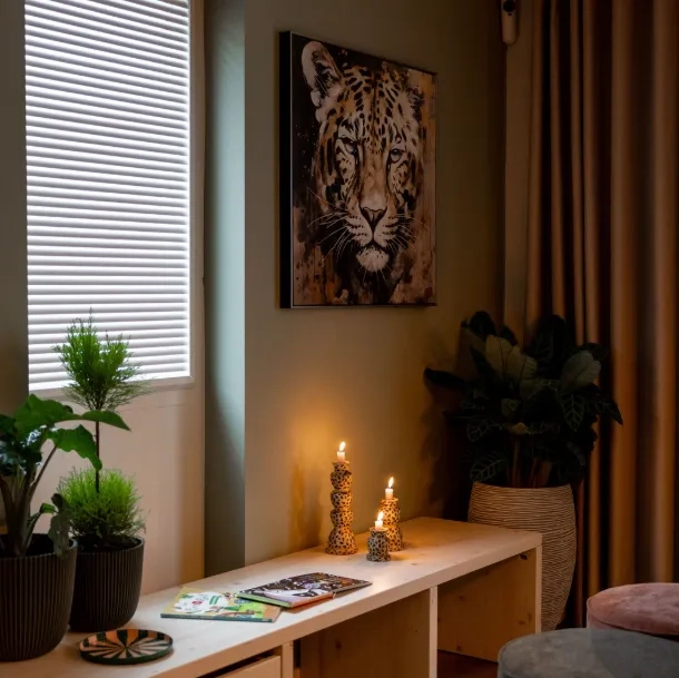 Voor de raamdecoratie is gekozen voor de Splendid Pliss: een stijlvolle, op maat gemaakte oplossing die in een frame wordt geplaatst, waardoor boren of schroeven niet nodig is. Ideaal voor wie een strakke afwerking wil zonder het kozijn te beschadigen. De keuze viel op de D5125, een DUO-stof met aan beide zijden een kleur. Dit zorgt voor een rijkere uitstraling en voegt extra warmte toe aan de ruimte, meer dan bij een standaard stof het geval is. Zo combineert deze raamdecoratie functionaliteit met een sfeervol en verfijnd resultaat.