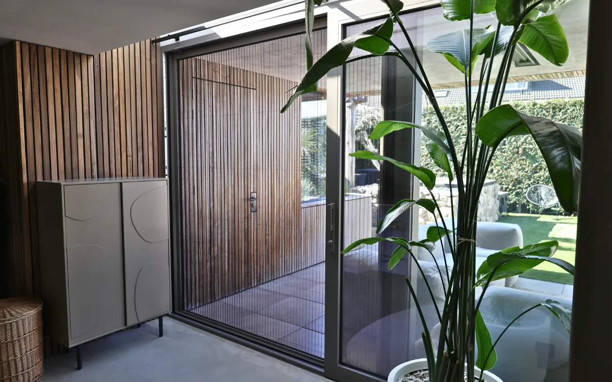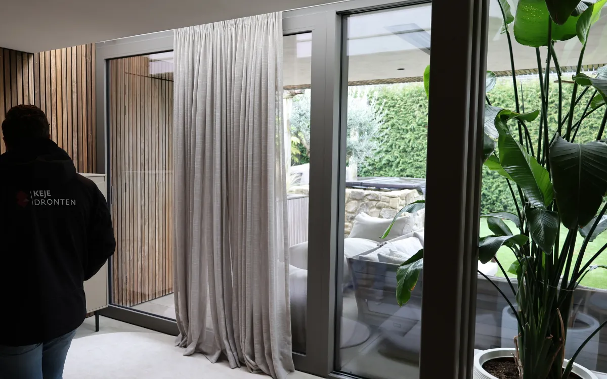 De oplossing van KeJe bleek een perfecte match: een hordeur die geschikt is voor hun meer dan twee meter brede schuifpui én volledig afgestemd kon worden op de kleur van de pui (RAL 7006). Dit zorgde voor een naadloos en chique geheel, dat zowel praktisch als esthetisch perfect aansluit bij hun woning. Het resultaat is een comfortabele leefomgeving waarin binnen en buiten moeiteloos in elkaar overlopen, zonder in te leveren op uitstraling.