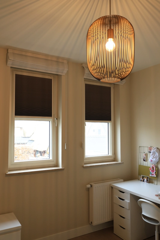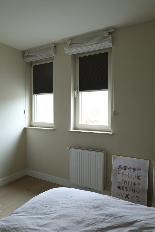 In de slaapkamer is gekozen voor de KeJe Splendid Pliss in framekleur 9001, gecombineerd met onze verduisterende stof C76008. Deze stof zorgt voor een volledig verduisterde omgeving, ideaal om ’s ochtends langer te kunnen slapen of voor een ontspannen middagdutje. Door de maatwerkoptie past de Splendid Pliss perfect in het raam, waardoor de slaapkamer een strakke, verzorgde uitstraling krijgt en er geen lichtkieren ontstaan.