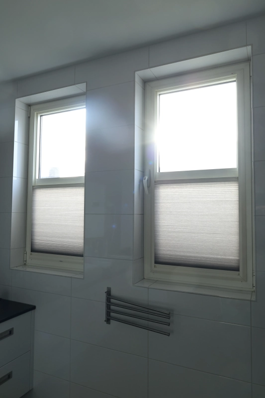 Voor de badkamer is gekozen voor dezelfde framekleur 9001, maar dan met de lichtdoorlatende stof D74106. Deze stof laat subtiel daglicht binnen, waardoor de ruimte fris en licht blijft, terwijl de privacy volledig behouden blijft. Dankzij het maatwerk past het frame precies in het raamkozijn, waardoor de badkamer een nette, opgeruimde uitstraling behoudt en de raamdecoratie stabiel blijft zitten, zelfs bij het openen of kantelen van het raam.